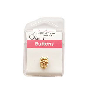 Botón metálico dorado con forma de calavera, ideal para darle todo el estilo rockero a tus proyectos.