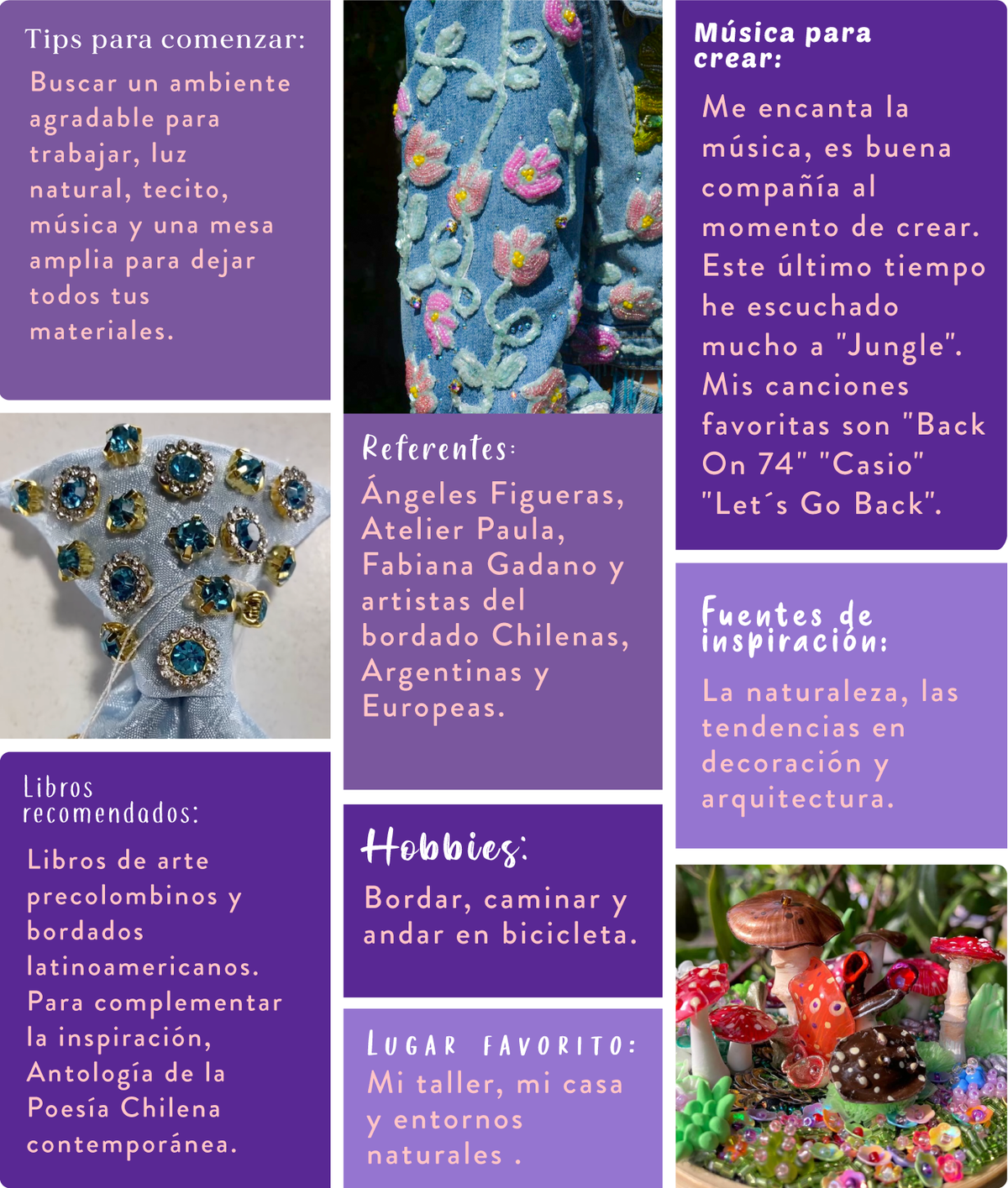 Migna nace en 2020, luego de muchos tropiezos y pruebas anteriores, con la idea de reutilizar prendas, dándoles una nueva vida para que cuenten nuevas historias. Luego de pasar una etapa difícil en mi vida, hizo que me conectara y aferrara aún más a los hilos y agujas. Mis bordados se transformaron junto conmigo y cree una nueva línea de chaquetas con mucha pedrería, diseños únicos para cada mujer, hice de una prenda una obra de arte. Atelier Paula me incentivó a explorar aún más el uso de plásticos incorporándolos a mis bordados con hilos y pedrería. Dedique horas al estudio del reciclaje, su conformación, usos, impacto ambiental y formas de reutilización. Explorar y experimentar con el plástico me llevó a crear carteras, accesorios y jardines fungi. Si quieres saber más de mí, te invito a seguir mi página de Instagram @migna_arte.ecotextil.