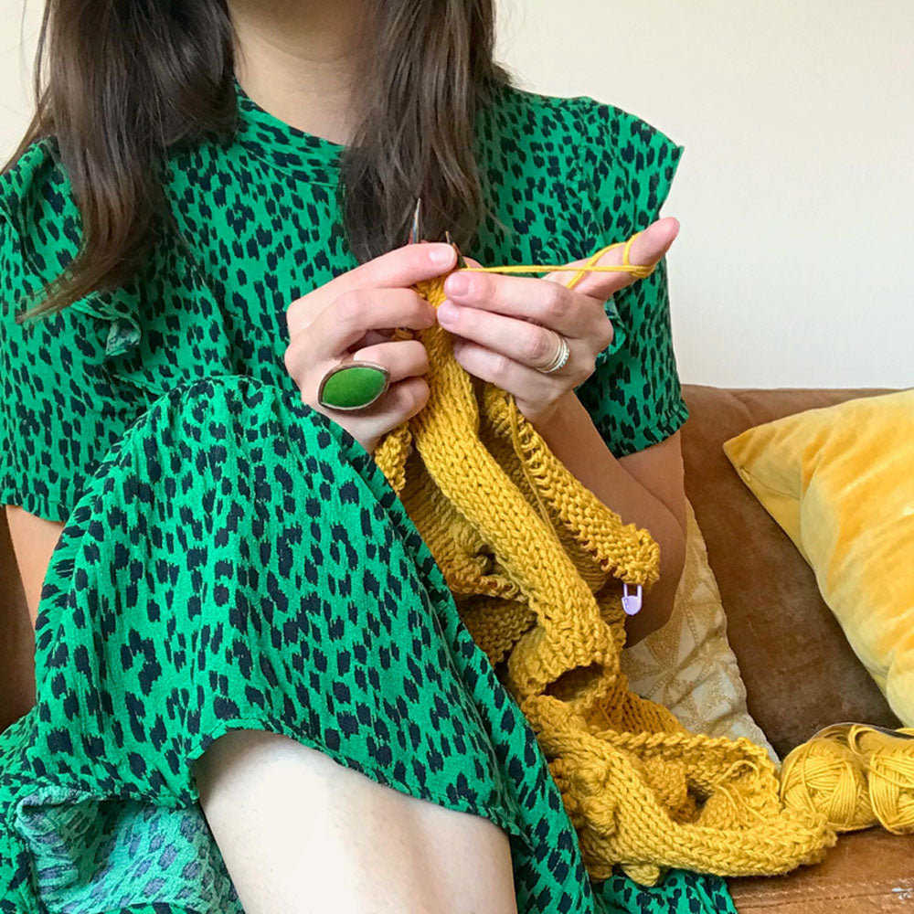 Al llevar 4 o más ovillos Blue Jeans, agrega a $1 el Patrón Brioche Cardigan