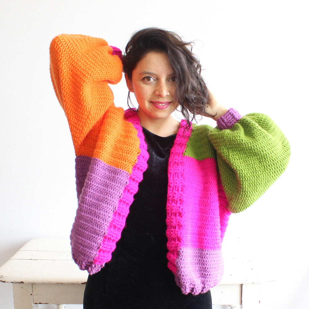 Al llevar 4 o más ovillos Blue Jeans, agrega a $1 el Patrón Brioche Cardigan