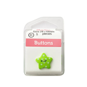 Lindos y divertidos botones con forma de estrella, en vibrantes colores con estampado de puntitos blancos. Ideales para proyectos infantiles.