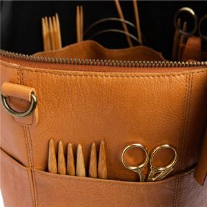 El interior espacioso incluye bolsillos internos y externos para mantener todo en orden. Dos aberturas superiores permiten pasar el hilo directamente desde el interior mientras se teje, manteniendo la lana libre de enredos y siempre a mano.