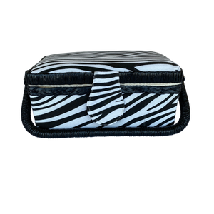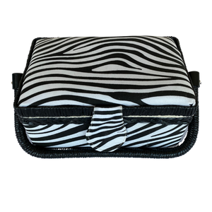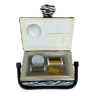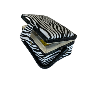 Práctico y lindo costurero forrado en tela Animal Print. Su tamaño y peso es ideal para llevarlo o guardarlo donde quieras. Está cuidadosamente acolchado, contiene bolsillos y un alfiletero incorporado en su interior.