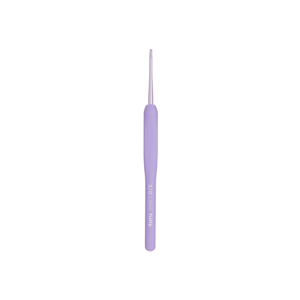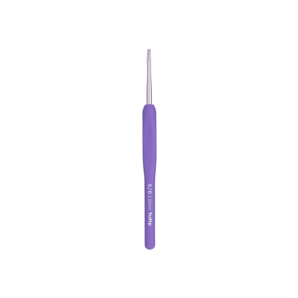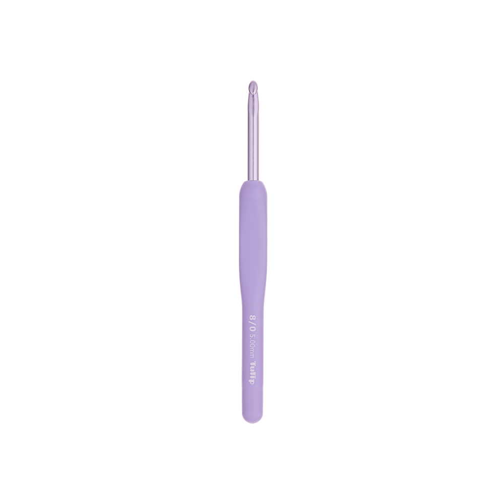Cada crochet tiene un mango acolchado en tonos lavanda, diseñado para adaptarse cómodamente a la mano y reducir la fatiga al tejer. La punta de aluminio pulido permite que el hilo se deslice con fluidez, facilitando puntadas uniformes incluso en hilados delicados.