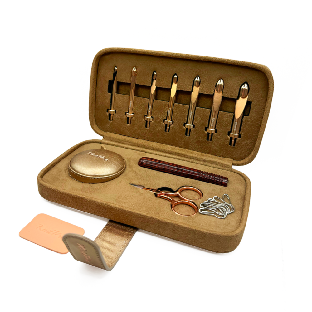El set de crochet intercambiable es un regalo ideal para amantes del crochet, o un set que no querrás dejar de tener en tu colección. Cada aguja en color gold rose combina perfecto con el elgante mango de madera que los acompaña.