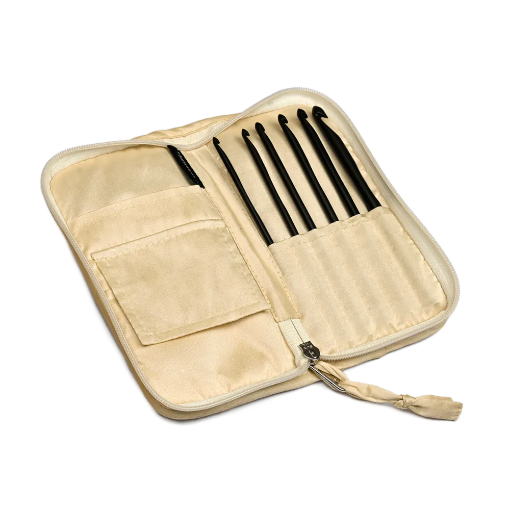 Este Set tiene 6 crochets y vienen en un empaque de seda Khadi de color beige, los múltiples bolsillos te permitirán mantener tus accesorios, como marcadores de punto o tijeras, organizados y al alcance de la mano mientras trabajas en tu último proyecto.