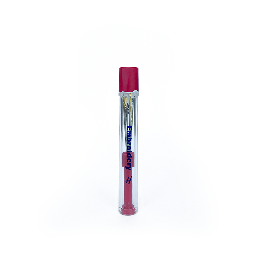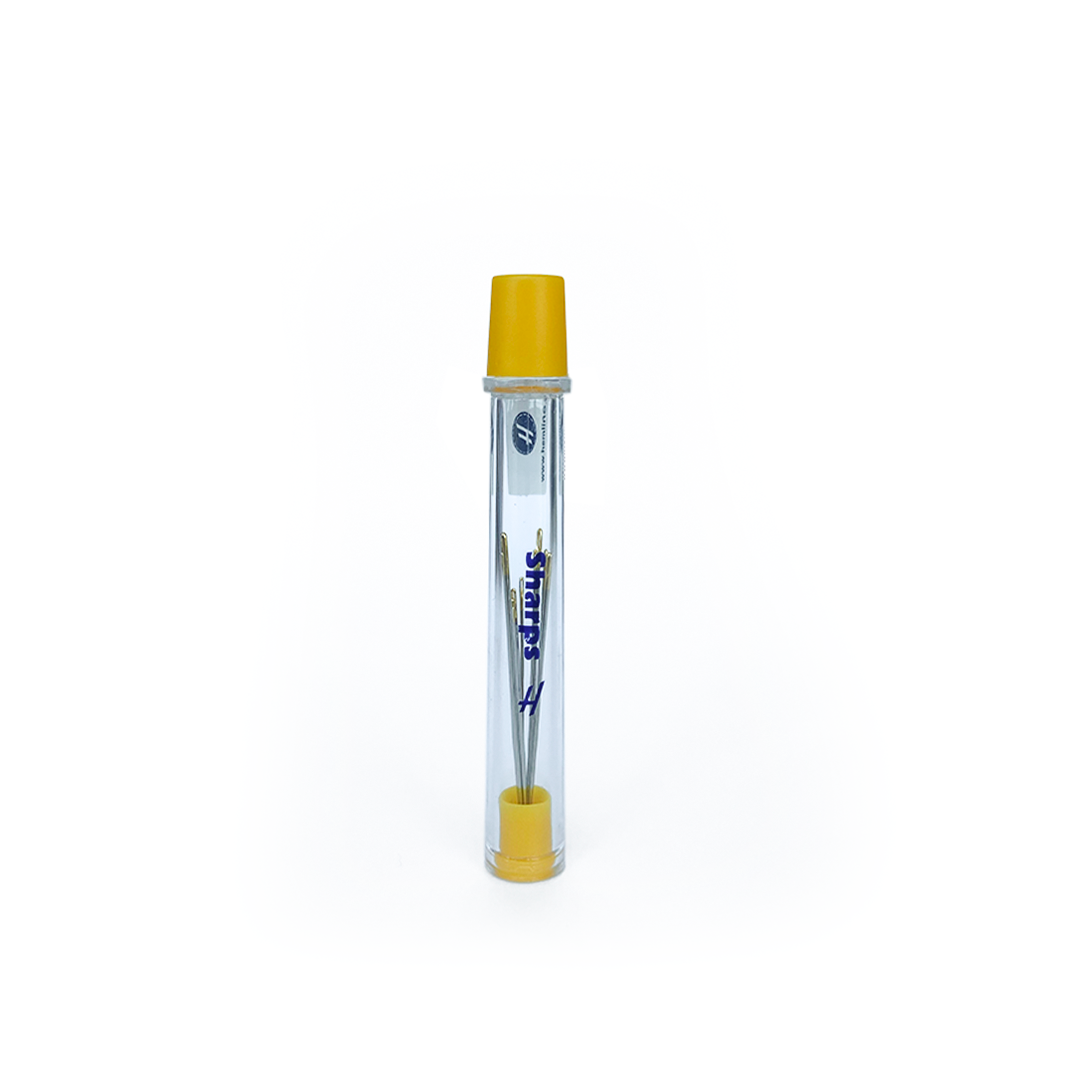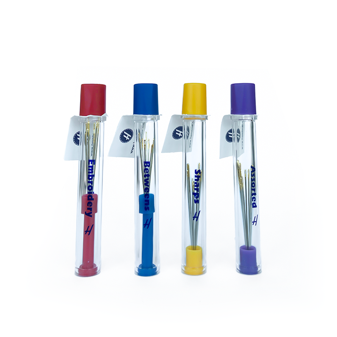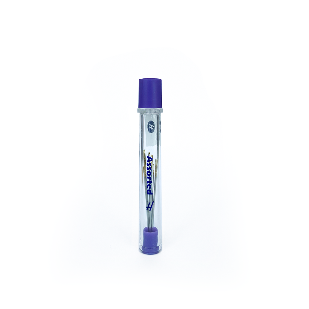 Estuche de plástico con capacidad para agujas de hasta 6,3 cm / 2,5" de longitud. Cuenta con un imán Push-up que ayuda a dispensar las agujas.Cada tubo contiene 8 agujas de ojo dorado con el tipo de aguja impreso en el cuerpo del tubo: