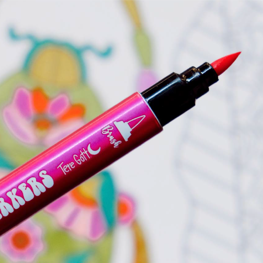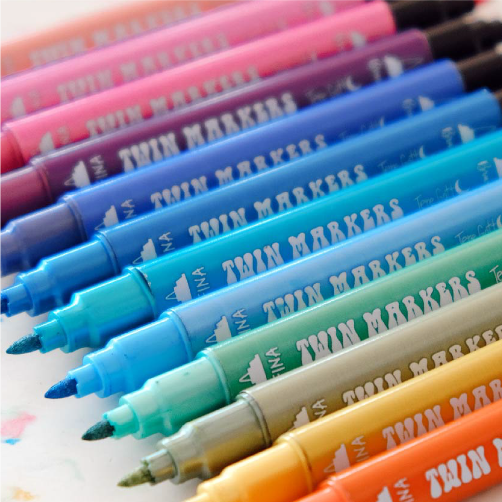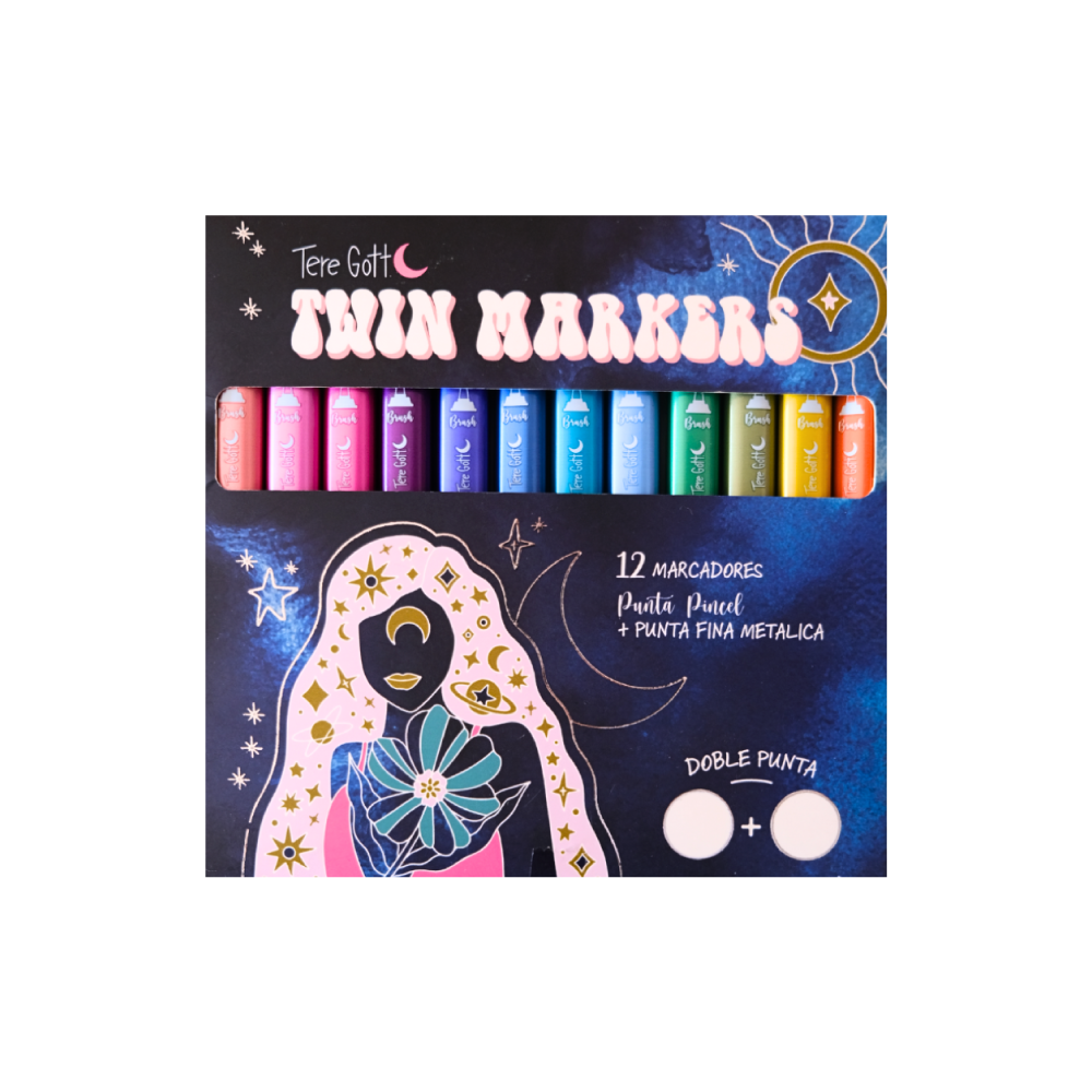 Los Twin Markers de Tere Gott son un set de 12 marcadores doble punta (pincel y fina metálica), que ofrecen 24 colores brillantes elegidos y combinados por la autora para crear acabados llenos de chispa y detalle.