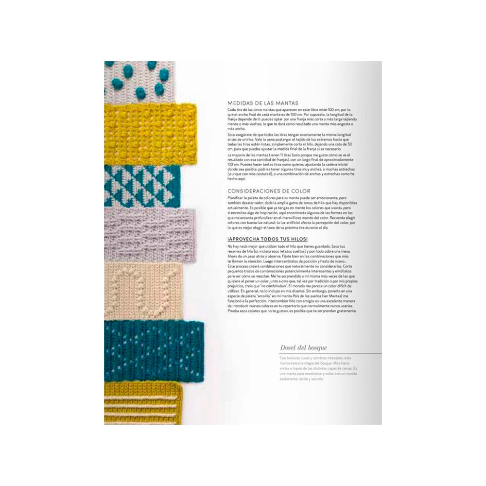 Cada proyecto incluye un esquema completo con abreviaturas, diagramas y fotos del modelo terminado, ofreciéndote un sinfín de opciones en texturas, paletas de colores y técnicas que combinan lo clásico con lo moderno. Además, encontrarás cinco ejemplos únicos de mantas que te inspirarán a crear tus propias obras maestras.
