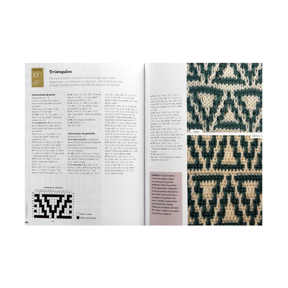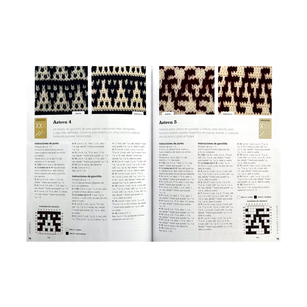 Incluye diagramas, muestras tejidas y explicaciones claras para cada patrón. Desde motivos geométricos hasta detalles más orgánicos e inspirados en culturas tradicionales, es un recurso perfecto para elevar tus proyectos y explorar nuevas combinaciones de color y textura.