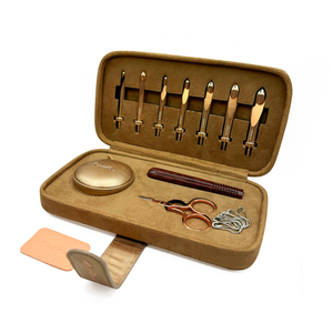 El set contiene: 7 cabezales de crochets intercambiable del 5.50 al 8.00 mm, 1 mango de madera, 1 tijera, 1 cinta métrica, 10 marcadores de puntos y 1 elegante estuche de gamuza ideal para llevarlos contigo siempre.