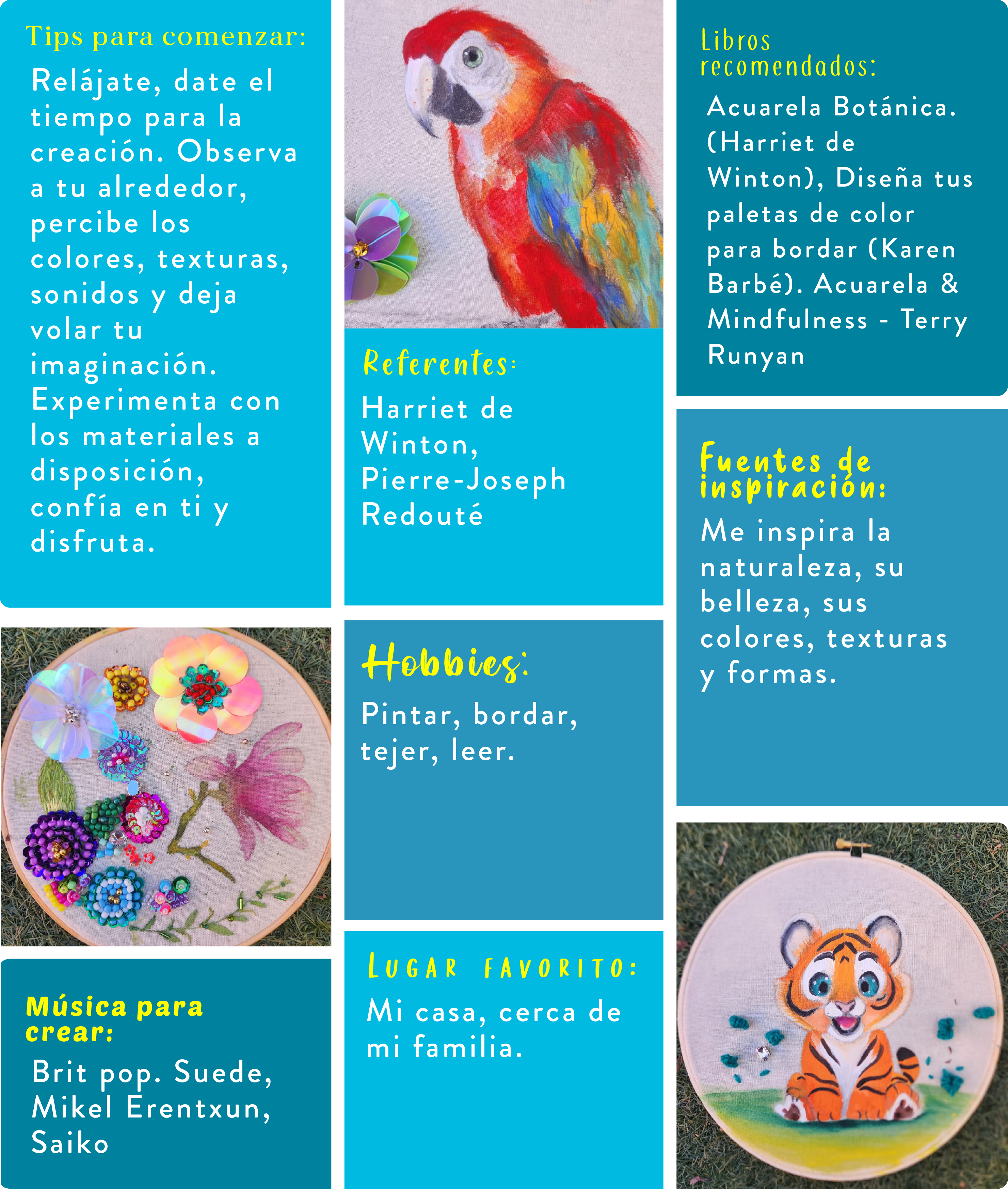 Psicóloga clínica de profesión, artista, ilustradora y magíster en Artes en la Salud y Arteterapia. Como profesora de acuarela, he colaborado en libros ilustrados y libros para colorear. Vivo en Santiago con mi esposo y mi hija. Soy una artista apasionada, con una profunda conexión con el mundo del arte y la expresión creativa. Como ilustradora y arteterapeuta, creo que el arte tiene el poder de transformar y sanar. Me dedico a explorar sus posibilidades en todas las formas. Mi trabajo se caracteriza por una mezcla de técnicas y estilos, desde la delicadeza de la acuarela hasta la vibrante energía del acrílico y el bordado. Me inspiran las texturas, los colores y las formas de la naturaleza, busco capturar su esencia en mis creaciones. ¡Te invito a conocer mi trabajo!