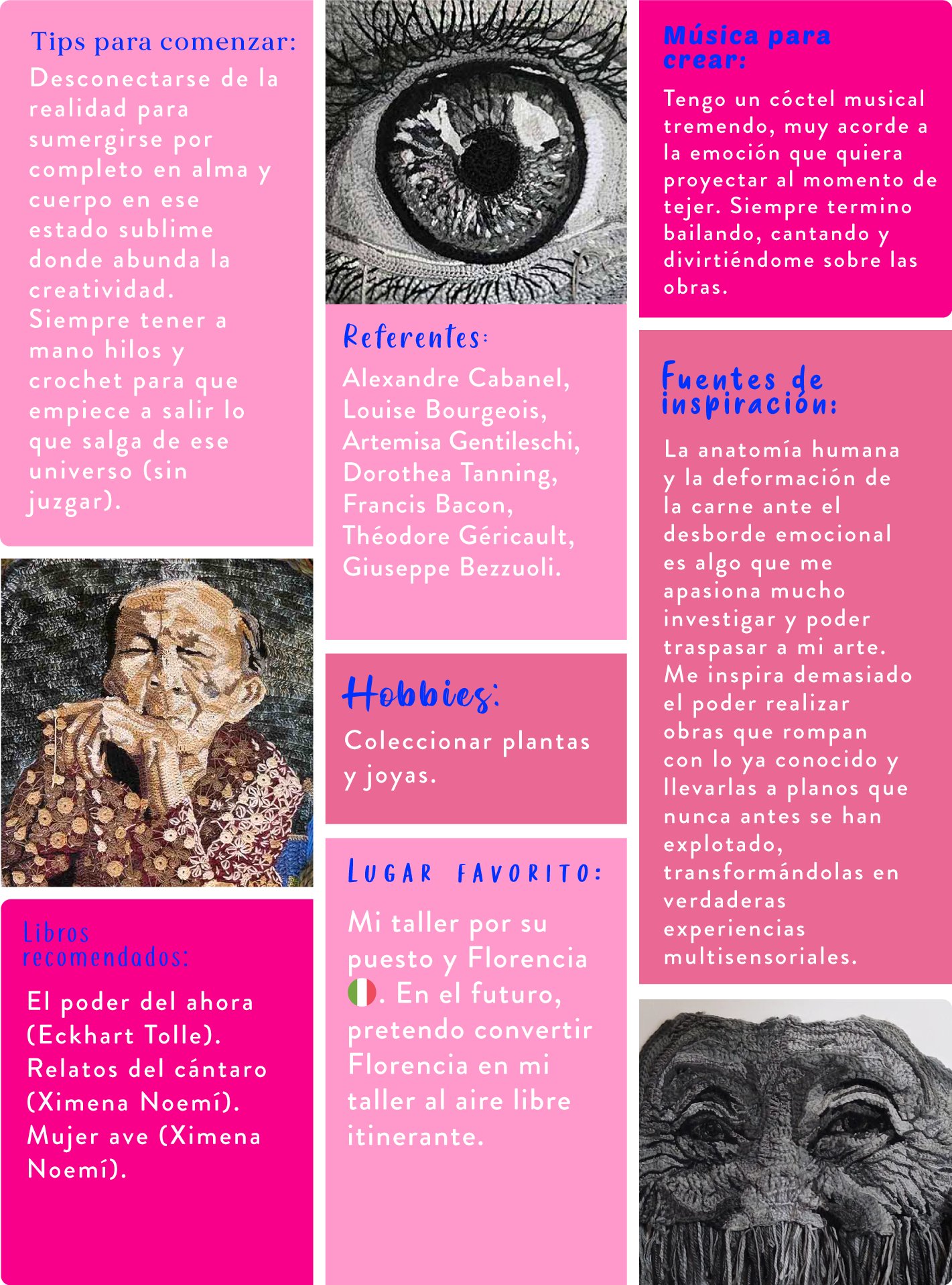 Hola! Mi nombre es Cecilia Acevedo tengo 35 años Talquina, kinesióloga de profesión y comencé a tejer cuando tenía 6 años, pero no fue hasta llegada la pandemia, en qué caí en una gran depresión y fue el tejido el que me sacó de ella, cuando me di cuenta de que "había venido al mundo a tejer", pero no como cualquiera, sino como una "Diosa". Fue entonces que mi misión fue dominar el crochet a diestra y siniestra y hacer que me obedeciera en todo lo que yo quería. Fue cuando llegué por accidente a hacer mi primera obra de Arte "Mundo Cuántico" causando un revuelo a nivel europeo por redes sociales. Luego comencé a mezclar mis conocimientos de kinesiología con el crochet y comencé a hacer Retratos realistas, los cuales de forma terapéutica me sacaron de la depresión. Actualmente, soy una artista validada por mi entorno con una vasta experiencia nacional e internacional y recientemente galardonada con los premios internacionales "Botticelli" el pasado 20 de enero en Florencia y próximamente el "Leonardo Da Vinci" edición de oro el 13 de Abril en Milán y el 12 de junio en Venecia con el "Phoenix". Trofeos que con orgullo traeré a Chile, demostrando que el crochet está compitiendo al mismo nivel que siglos de Arte hecho con pinceles.