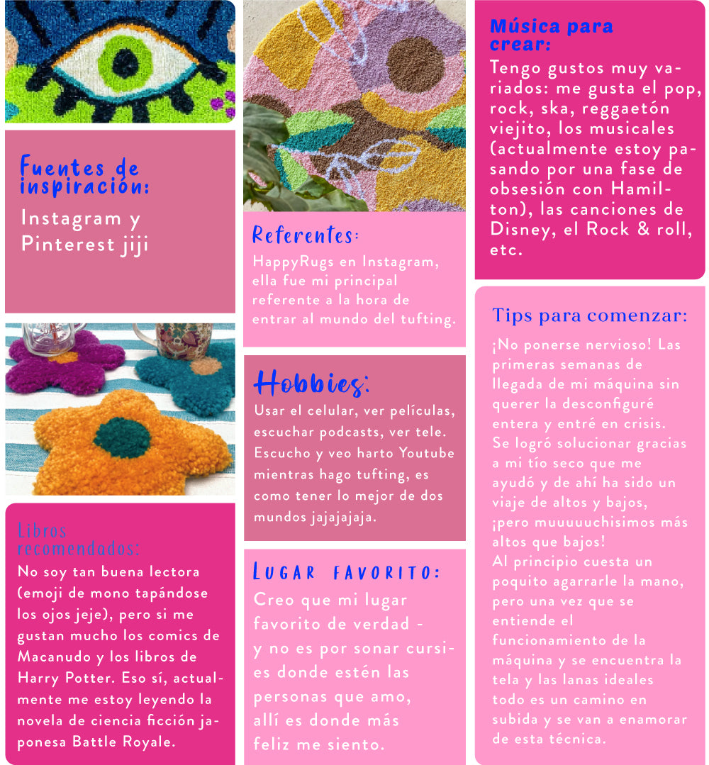 ¡Hola! Me llamo Fernanda Monasterio, tengo 26 años y soy periodista de profesión. Actualmente trabajo en un medio multiplataforma llamado PAUTA y además tengo mi emprendimiento @deptotextil, donde vendo láminas decorativas enmarcadas y alfombras hechas por mí con la técnica de Tufting. Comencé a trabajar con la Tufting Gun en el 2021, aprendí viendo videos de youtube y buscando información en Instagram, realmente me fascinó la técnica y hoy en día me dedico más que nada a hacer pedidos personalizados de distintas cosas: flores, animales, textos, abstractos. ¡Todo lo que te puedas imaginar se puede lograr con la tufting gun!¡Anímate a probar esta nueva técnica!