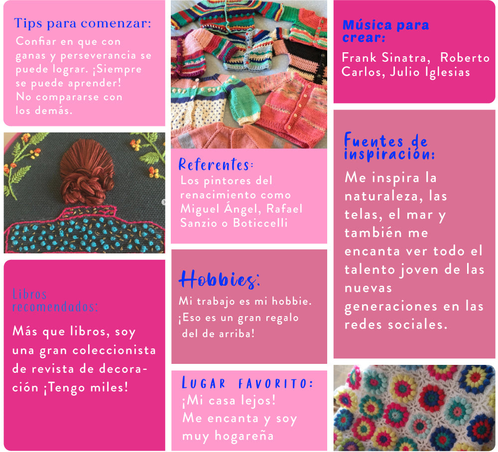 Tengo 72 años, soy casada, mamá de 2 hijos y ocho nietos que adoro. Soy Asistente Social y estudié 4 años en el Bellas Artes. Mi pasión en la vida son las manualidades y la estética. Creo que la belleza eleva el espíritu y hace bien para el alma. Hace más de 40 años partí haciendo clases en mi casa de todo tipo de manualidades para conciliar mi trabajo con la crianza de mis niños. No sólo mis alumnas han aprendido de lo que humildemente y con cariño les he enseñado, ¡Yo también he aprendido mucho de ellas! He conocido a mujeres fabulosas, luchadoras, alegres y trabajadoras con las que en torno a un bordado o unos palillos, hemos construido vínculos muy fuertes y profundos. Me encanta disfrutar de mi familia, un rico picoteo, la risas de mis nietos o un lindo jardín. Con las cosas simples de la vida y en los pequeños detalles, encuentro muchos momentos de felicidad e inspiración.
