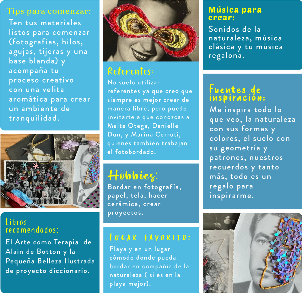 ¡Hola!, mi nombre es María Jesús Sáez Cerda y soy Arquitecta y Artista. El 2016 y de manera intuitiva comencé a bordar papel, lo que me llevó a la exploración del bordado en superficies distintas a la tela, bordando mis collages hasta llegar al bordado en fotografía. Las ganas de continuar investigando con el fotobordado, me llevaron a realizar la maestría en Bellas Artes en la Universidad de Sevilla, realizando mi tesis donde pude plasmar mi experiencia para con la técnica que me acompaña desde hace algunos años. Para diferenciar mi arte de la fotografía bordada, el 2021 cree la plataforma llamadaFotobordadoChilecon la intención de acercar y visibilizar a toda persona que trabaje el fotobordado en nuestro país. La idea es crear una comunidad de artistas y creativos para difundir este arte, realizando exposiciones colectivas, talleres e instancias que potencien el recuerdo, la reflexión, la imaginación, la creatividad y el bordado. Te invito a que nos acompañes a crear.