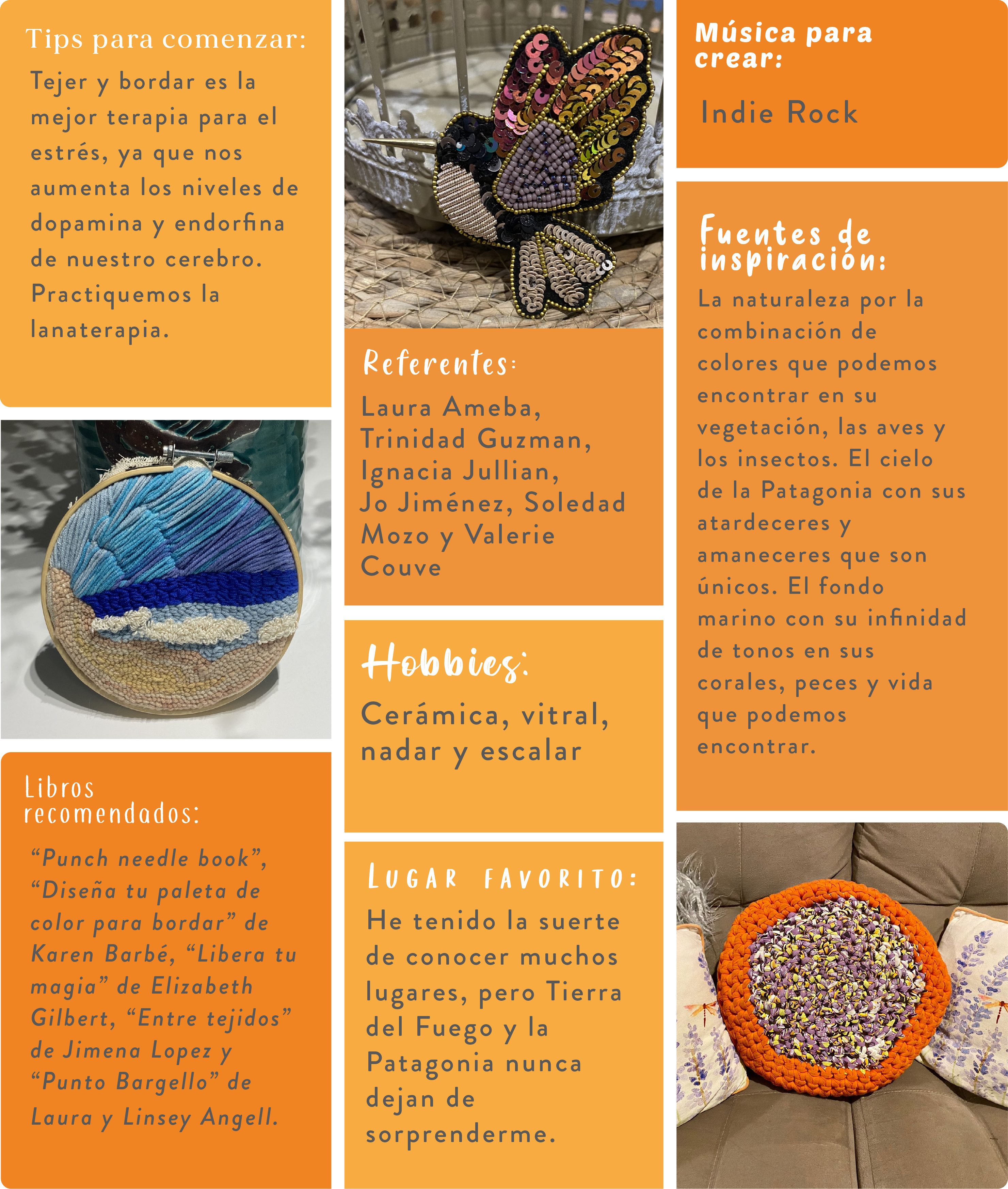 ¡Hola! Mi nombre es Angélica Luardo. Soy enfermera, bordadora y tejedora. Desde el 2020 vivo en Punta Arenas. Mi interés por las manualidades nace desde muy pequeña, gracias a mi mamá. A los 7 años me enseñó a coser con retazos de tela de sus trabajos de costuras. A medida que fui creciendo, quise aprender a tejer a palillo y, una vez más, fue mi mamá quien me enseñó a montar los puntos y tejer. El crochet lo aprendí en mi adolescencia de manera autodidacta. Cuando empecé a trabajar como enfermera, retomé el tejido como una forma terapéutica de manejar el estrés y en la pandemia, esto fue mi salvación. En ese momento conocí la técnica del punch needle que me llamó mucho la atención, por utilizar una aguja hueca, al igual que las que utilizo para puncionar a mis pacientes. Descubrí que los movimientos repetitivos de pinchar la aguja en la tela me relajaban y decidí enseñar la técnica a otras personas para ayudarlas a sentirse mejor. Hoy en día me dedico a realizar talleres de diversas técnicas como punch needle, bordado en pedrería, bargello y crochet. Al enseñar, me di cuenta de lo satisfactorio que es para mí ver los rostros de mis alumnos cuando logran dominar la técnica o cuando ven con orgullo sus trabajos terminados y pueden decir “yo lo hice con mis manos”