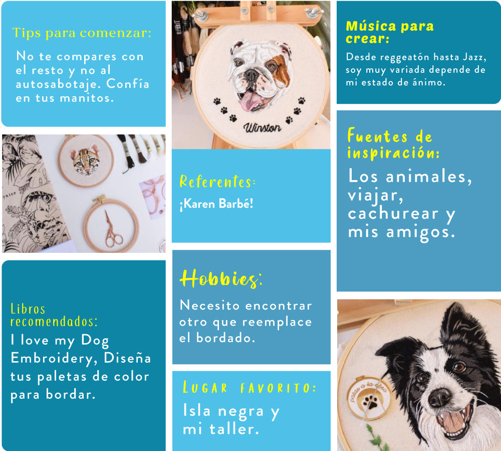 Soy Valentina Castillo Mora, Diseñadora gráfica de la U. de Chile, artista de bordado y profesora en Domestika. Tengo 29 años, vivo en Santiago de Chile y tengo dos perritos: la Pipi y el Choripán. Comencé a bordar el 2014 como un hobby para sanar mi depresión y ansiedad, todo impulsado por mi abuelita y mi sicóloga. Al comienzo bordaba ilustraciones de animales, ya que siempre me gustó dibujar y sentía que los hilos reemplazaban mis lápices de colores. Todo se dio de forma autodidacta e innata, no tenía conocimientos de de bordado y sólo daba puntadas sueltas. Al tiempo fui aprendiendo que existían distintos puntos y aprendí a trabajar con solo una hebra. Durante mi aprendizaje de bordado, muere mi perrito de toda la vida Jazz y al poco tiempo Chester el perrito de mi amiga, lo que me motivó a bordar sus memorias, haciendo el primer retrato de un perrito. Lo subí a mi Instagram y otras amigas me comenzaron a pedir que les hiciera a su puppy bordado. Luego, fui afinando detalles, colores, texturas, llegando a más realismo en cada retrato. Siempre quise vincular el bordado con el diseño, y en el 2019 fui a la Royal School of Needlework en Londres para aprender Silk Shading o needlepainting, que es la técnica en la que me especializo. Actualmente el bordado es mi trabajo de tiempo completo, doy cursos de bordado sobre needlepainting, hago retratos de mascotas. También participo en un podcast @loquecallamoslascrafters donde hablamos de lo que es tener un emprendimiento de oficios. Si te animas a aprender sobre el needlepainting y bordar a tu mascota puedes encontrar mis workshops en Revesderecho o tomar mi curso needlepainting para principiantes en Domestika. Estaré feliz de poder enseñarte.