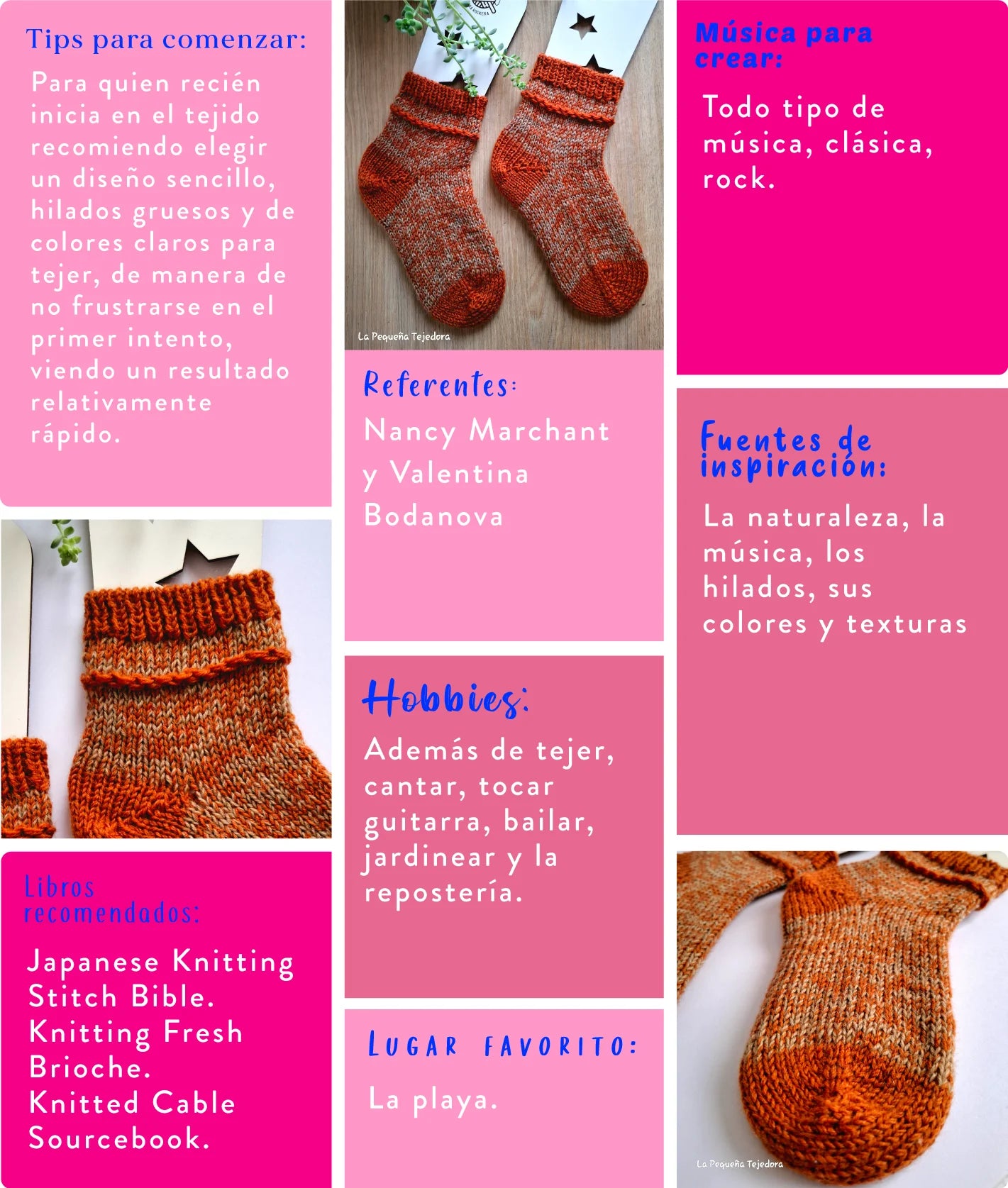 Soy Adriana, Ingeniera Comercial de profesión, dedicándome a mi pasión - el tejido-, diseñando prendas tejidas, haciendo patrones y enseñando a otras personas que vibran tanto como yo con esto. Tejo desde los 7 años, y muy tempranamente me sumergía en las revistas de tejido de mi mamá buscando puntos que le dieran texturas a mis tejidos. Con el tiempo he ido adquiriendo nuevos conocimientos y técnicas de manera autodidacta que aplico en mis diseños, tratando de innovar en cada nueva propuesta. Mi sello es el uso de encajes, trenzas y la técnica brioche en diseños delicados y en algunas ocasiones con algo de brillo -no demasiado- a través del uso de mostacillas e hilos metalizados. Actualmente, me dedico de lleno al tejido. Amo enseñar y me llena de orgullo ver a una alumna feliz por lo que ha podido tejer o cuando veo uno de mis diseños tejidos por otras manos. Mis diseños están disponibles en Ravelry y cuento con un canal en Youtube con videos de apoyo a mis patrones.