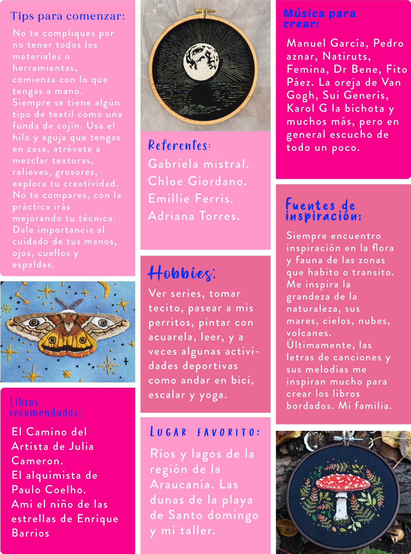 ¡Hola! Mi nombre es Carol Cuadra, actualmente estudio Diseño Gráfico digital, soy géminis (no es el peor signo). Hace unos años resido en la comuna de Pucón, región de la Araucanía. Más de una vez al año viajo a Santiago de visita o por motivos de trabajo. Vivo con mi compañero y mis 3 perritos amados. Mi amor por los oficios comenzó porque me sentía perdida, dejé la universidad y llegó la pandemia. Por todo eso, decidí darme tiempo y espacio para conocerme y explorar diversas actividades. Encontré el mundo de lo manual y artístico, el cual me encantó y me enamoré. Comencé por el journaling y la encuadernación, luego vino el bordado y mezcle la encuadernación con tapas bordadas. También me gusta el prensado botánico, la cianotipia botánica y la acuarela. Las manualidades se me dan bien y me hacen bien. Pero al oficio que le dedico la mayor parte de mi tiempo es el bordado, me acerque a este porque una amiga me comento que ella creía que yo debería bordar, pero mi amiga nunca había bordado, su comentario capto mi curiosidad, un día en la feria cachureando vi un kit de bordado y comencé a bordar sin parar explorando muchos estilos, telas e hilados. Luego de años de práctica, de leer varios libros, tomar diversos talleres y encontrar mi propio estilo y mezcla de técnicas, me anime a enseñar, principalmente de manera online para poder llegar a otros territorios. El bordado ha sido una actividad que potencia mi creatividad, me entrega momentos de meditación y mucha paz, me lleva a confiar en el proceso, es una herramienta que ayuda a expresarnos, liberarnos, opinar, crear, sentir, etc. Por eso y más te invito a que te animes a bordar, puede ser una actividad que te ayude en tu vida, así como ayudo en la mía. ¡Honra los talentos que tienes!