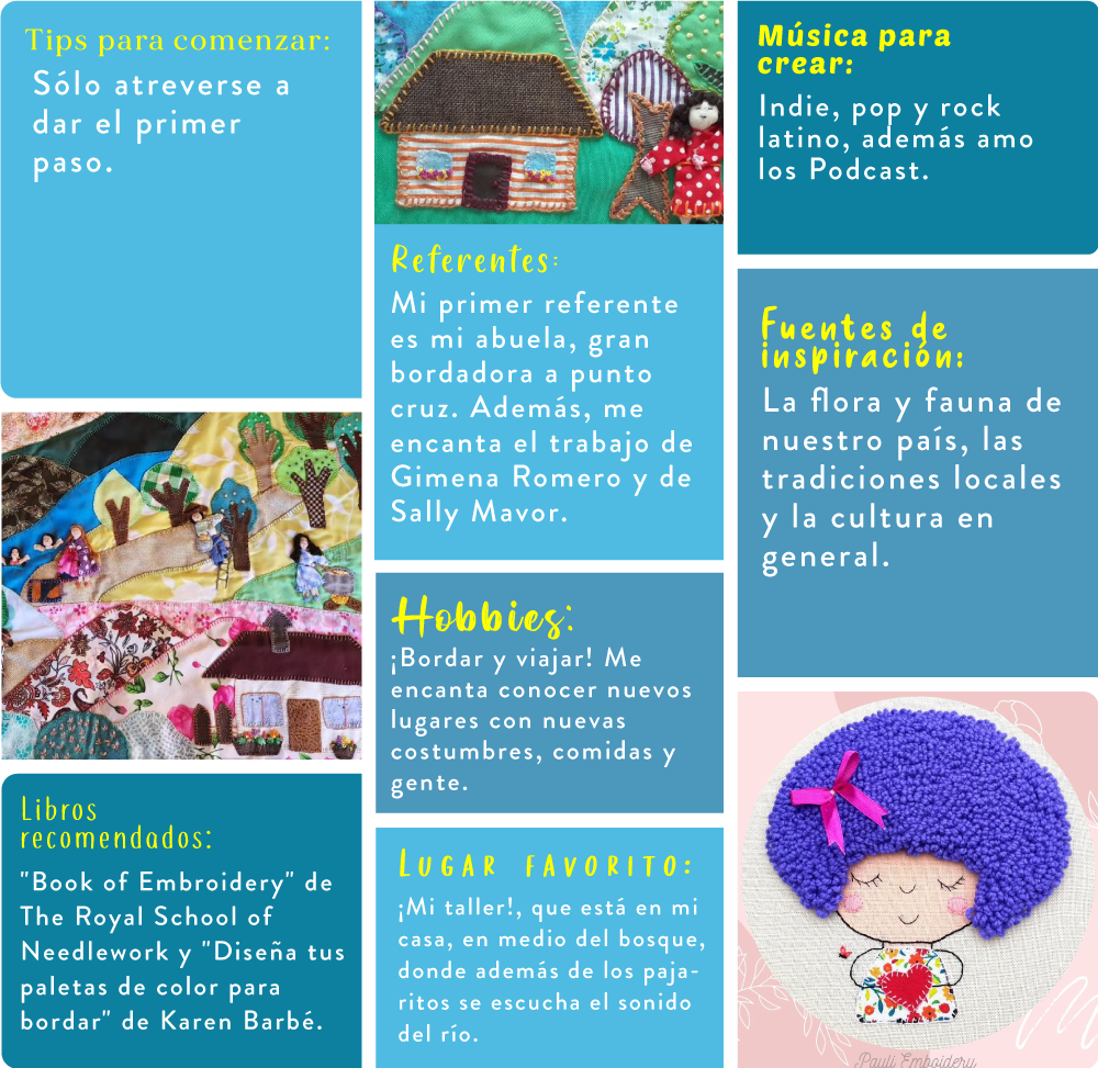 Mi nombre es Paulina Oses, soy de Pinto, región de Ñuble y apasionada por el bordado. Mi abuela me enseñó a bordar de niña y a lo largo de los años me he ido capacitando en diferentes técnicas. Me gusta experimentar con diversos materiales textiles, dado que su versatilidad me ayuda a expresar lo que siento. Soy Ingeniera Comercial de profesión, pero empecé a dedicarme al bordado y al textil como forma de vida en 2019, confeccionando artículos textiles con aplicaciones bordadas, en 2021 formalicé mi empresa “Pauli Embroidery” en donde reflejo toda mi creatividad a través del textil confeccionando artículos de tela, lienzos, prendas y participando en diferentes instancias culturales de mi región. Recientemente, me acredité como artesana textil ante el Ministerio de las Culturas, las Artes y el Patrimonio de Chile. Por otro lado, realizo proyectos culturales relacionados con el bordado, su puesta en valor y su permanencia en el tiempo, para lo cual además realizo talleres de bordado para compartir mi pasión y mis conocimientos con otros, dado que el conocimiento es el único recurso que al compartirlo se multiplica.