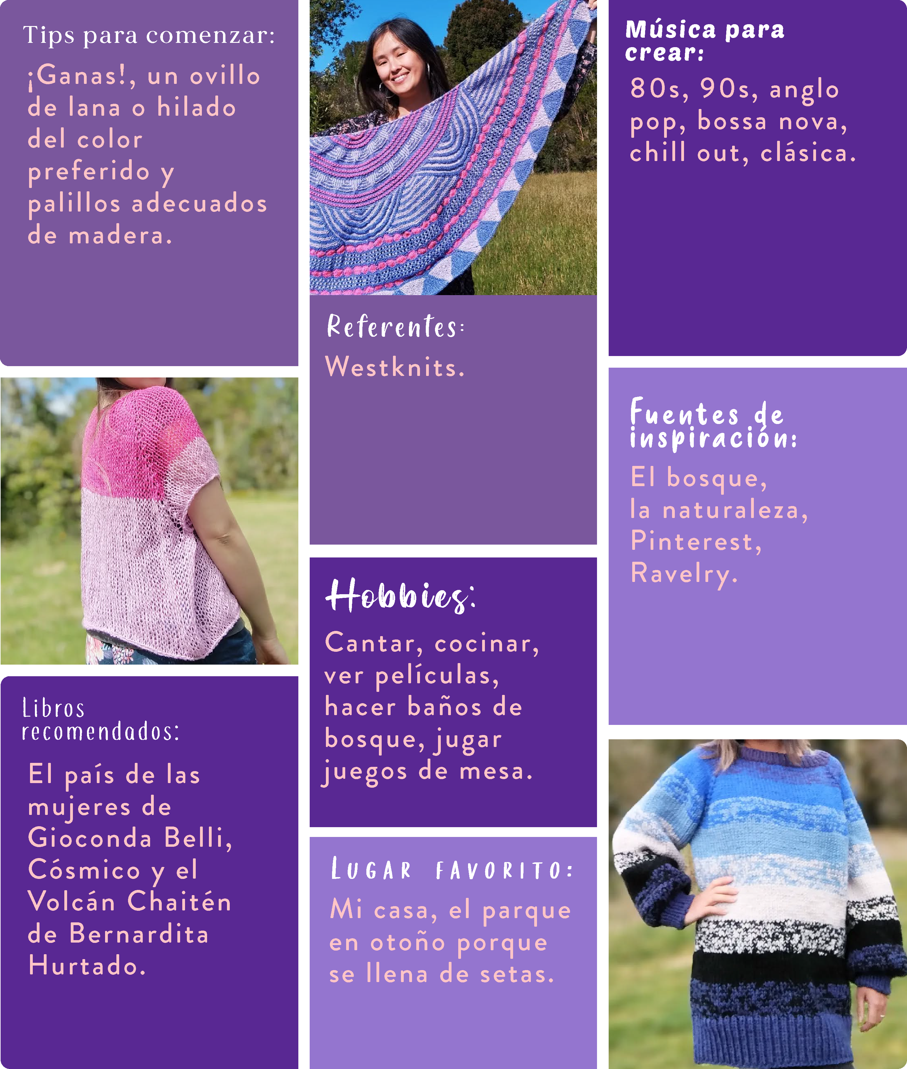 ¡Hola! Soy Fran de @la.ovejera, que es el espacio donde mezclo las cosas que más amo: ser veterinaria, el amor por el campo junto a la playa y el tejido. Vivo en Pichilemu y es allí donde creo tejidos y diseño patrones que tienen muchísimo detalle para que cualquiera pueda tejer sin problemas. Busco destacar el campo y sus animales a través de lo maravilloso de la lana de oveja, además de inspirar mis diseños con la vida de playa. Es por eso que me gustan los colores en un sweater, o el tejer una prenda cómoda, y en mi tejido expresar a través de diseños la naturaleza, también con técnicas como intarsia y jacquard.