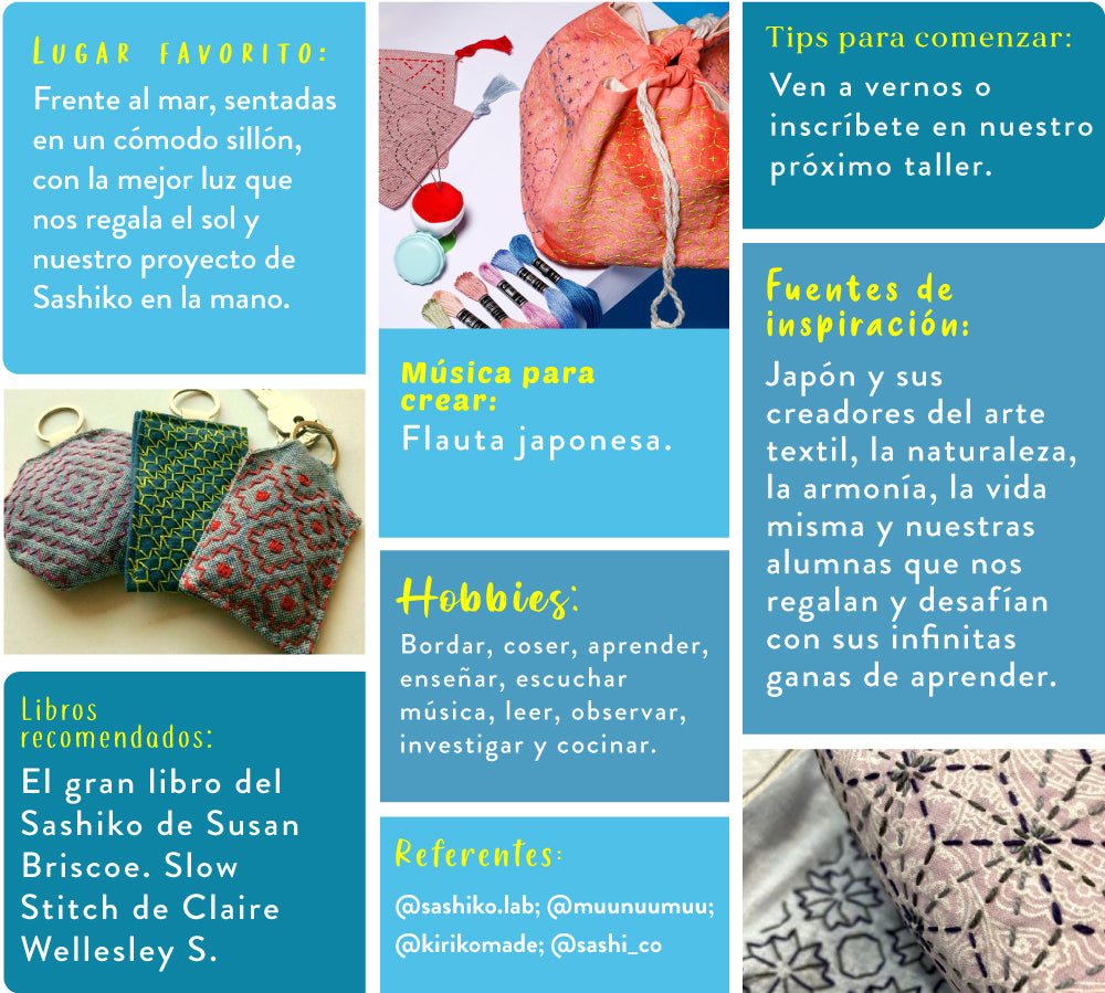 Andrea Barrios y Loreto Guzmán creamos@sincuentapuntos, un taller de bordado japonés donde nos reunimos para enseñar, compartir, crear en comunidad e intercambiar experiencias.Tenemos más de 10 años de estudio y experiencia en técnicas textiles japonesas y enseñamos principalmente Boro y Sashiko.Impartimos cursos en niveles desde el básico hasta el avanzado, hacemos talleres de proyectos personales o temáticos; de manera presencial y online.Más de 500 alumn@s han aprendido de esta técnica con nosotras y no pocos la siguen practicando y participando de nuestros talleres. Orgullosas, hemos expuesto nuestros trabajos y el de nuestras alumnas en exposiciones a nivel nacional.Contamos con una pequeña tiendita en nuestro taller, en la que encontrarás insumos específicos de Sashiko. También encontrarás algunos kits para bordar, elaborados por nosotras mismas, con telas recicladas, teñidas a mano con productos principalmente naturales, los que igualmente pueden encontrar en las inspiradoras tiendas de Revesderecho.
