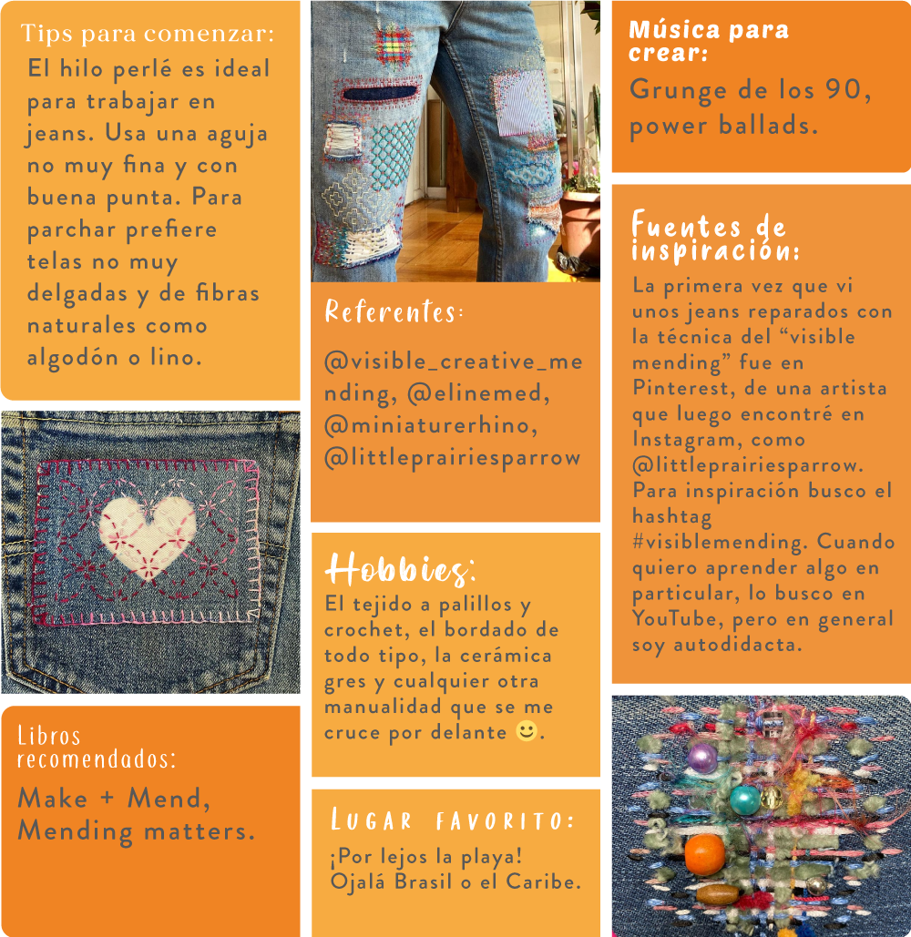 Mi nombre es Isabel Vicuña, nací en Viña del Mar, pero vivo en Santiago desde los 18 años, cuando me vine a estudiar Arte en la Universidad Católica de Chile. Desde el 2017 me dedico a enseñar a remendar ropa a mano con técnicas tradicionales aplicadas de una forma más creativa, para preservar nuestras prendas por más tiempo y darles un toque único. En mis workshops enseño: Zurcido visible, le damos un giro a la técnica tradicional con que tu abuelita te arreglaba los calcetines ?? y la llevamos a tus jeans ??, para darles nueva vida y al mismo tiempo hacerlos únicos. Parchado, inspirado en la técnica del Sashiko ?? pero sin tanta regla japonesa ??. ¡Vas a estar esperando a que se les haga un nuevo hoyo a tus pantalones!. Espejitos Shisha, técnica de la India para colocar espejitos en la ropa sin usar pegamento, solo una trama. ¡Tapa esa manchita de cloro o ese hoyito de polilla, vas a ver lo lindo que se ve! ??. Borde de Mostacillas ??, con esta técnica podrás decorar las orillas y costuras de tus jeans. Aprenderás a que las mostacillas queden en su lugar, bien obedientes y ordenaditas??
