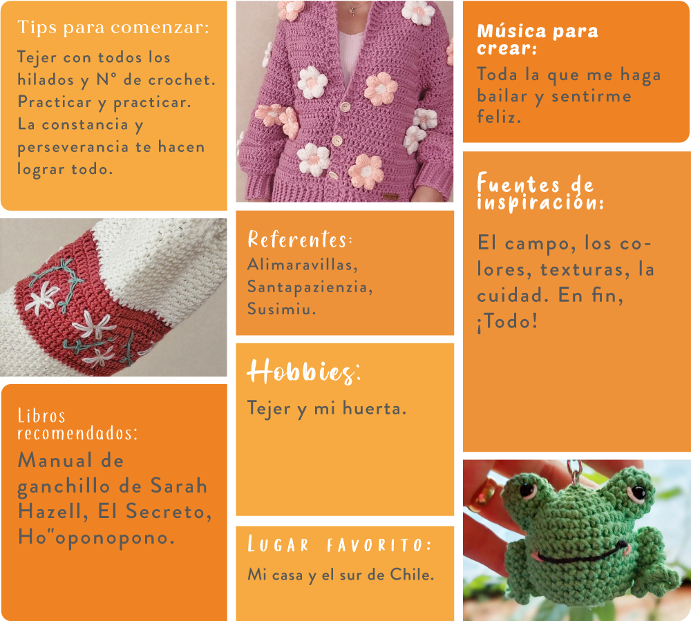 ¡Hola! Me llamo Cristina, me dicen Cristy. Soy la persona que está detrás de@urdimbretejido. Tengo 43 años y vivo en el campo con mi marido y mis 6 perros. Soy tejedora desde los 16 años. Mi mamá me enseñó a tejer a palillo y fue un mundo extraordinario. Después conocí el crochet y fue amor a primera vista; fui aprendiendo con revistas y amando cada vez más este arte. Tejer a crochet es mi estilo de vida, me inspiro en cualquier cosa, lo dibujo y empiezo a diseñar con puntos y texturas. No ha sido fácil dedicarse al tejido, pero la constancia y perseverancia me ha llevado a lograr todo esto y sé que vendrán muchas más cosas buenas. Los invito a ver mi Instagram, en donde vendo mis tejidos, y que asistan a mis clases en los Ángeles para que se puedan enamorar del crochet como yo y puedan diseñar sus propias prendas de vestir.