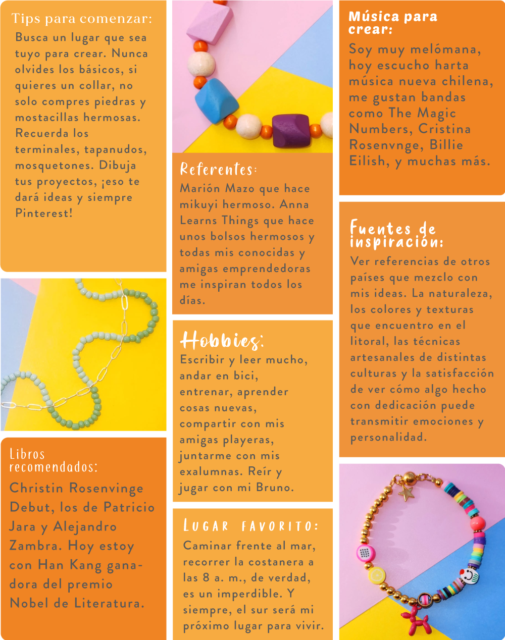 ¡Hola! Soy Geraldine, soy periodista y profesora de bisutería y hace dos años me mudé a Algarrobo, donde encontré el espacio perfecto para reactivar mi emprendimiento, Vivoligera. Me dedico a la creación de accesorios y a la enseñanza de bisutería, combinando diseño, creatividad y técnica para compartir este oficio con otras personas. Mi camino comenzó 25 años atrás con la inquietud de hacer algo con mis manos y la pasión por los detalles. Con el tiempo, transformé ese interés en un proyecto que no solo me permite crear, sino también enseñar y conectar con quienes buscan aprender una nueva habilidad. Mi mayor motivación es ver cómo, a través de cada pieza, mis alumnas descubren su creatividad y confianza. La playa me ha permitido vivir más lento, dedicarme a las cosas que me gustan y hacer actividades que me permitan conocer a más personas. Aquí vivo con mi familia, mi hijo de 4 años que me inspira y siempre me motiva a hacer más cosas. Me gusta el cambio de vida que hice y esto me motiva mucho para crear día a día.