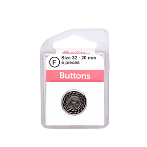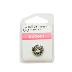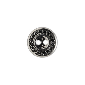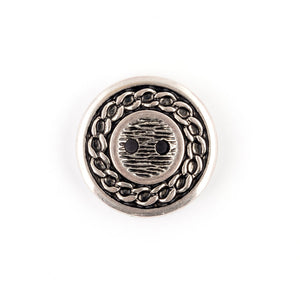 Botones metálicos silver con un lindo diseño de cadena en el borde, encuéntralo en dos tamaños y combinalos con tus proyectos de temporada.