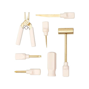 Incluye: 1 destornillador plano","1 destornillador de estrella","1 martillo","1 punzón","1 tenazas","1 mini sierra con mango extraíble y un estuche para guardarlo todo.